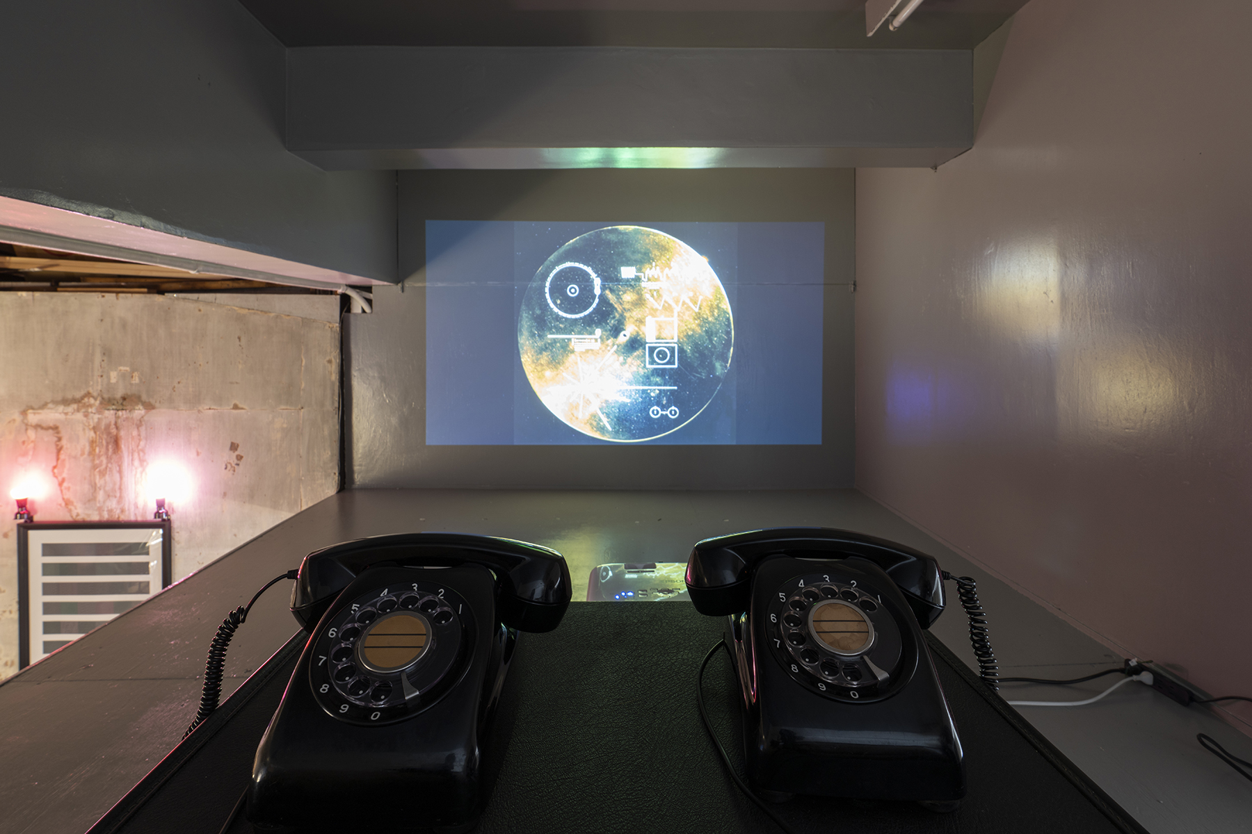 2つの平面と照明は、ボイジャーのゴールデンレコード(以下,GR)に収録されたヨハン・セバスチャン・バッハ作曲のブランデンブルク協奏曲第二番(以下、BWV 1047)の第1楽章にまつわるものである。ここではルートヴィヒ・ウィトゲンシュタイン(以下、LW)の定義する「像」についてアプローチしている。大づかみの理解では、LWのいう像とは現実の模型である。私たちは、現実を伝達・表現するときに、現実それ自体を再現不可能なため、言語や音、絵などで表す。これをLWは現実の模型=「像」だという。ぼくはBWV 1047の複数の「像」を投射した。